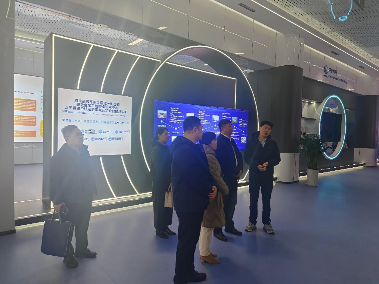 调研组一行首先来到山东有研艾斯半导体材料有限公司。作为国内半导体材料领域的领军企业,山东有研在大尺寸硅材料研发与生产方面具有显著优势。在企业展厅与生产车间,调研组一行详细了解了半导体材料的制造工艺、技术攻关及应用前景,并就材料科学前沿课题与企业技术人员进行了现场交流。